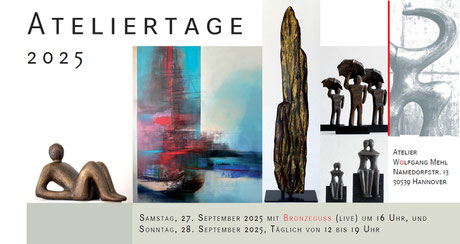 Herzliche Einladung zu den Ateliertagen 2025. Ausser meinen Skulpturen und Objekten sind Bilder in Mischtechnik von Mara Schleper ausgestellt. Bringt gerrne Familie, Freunde und Bekannte mit.